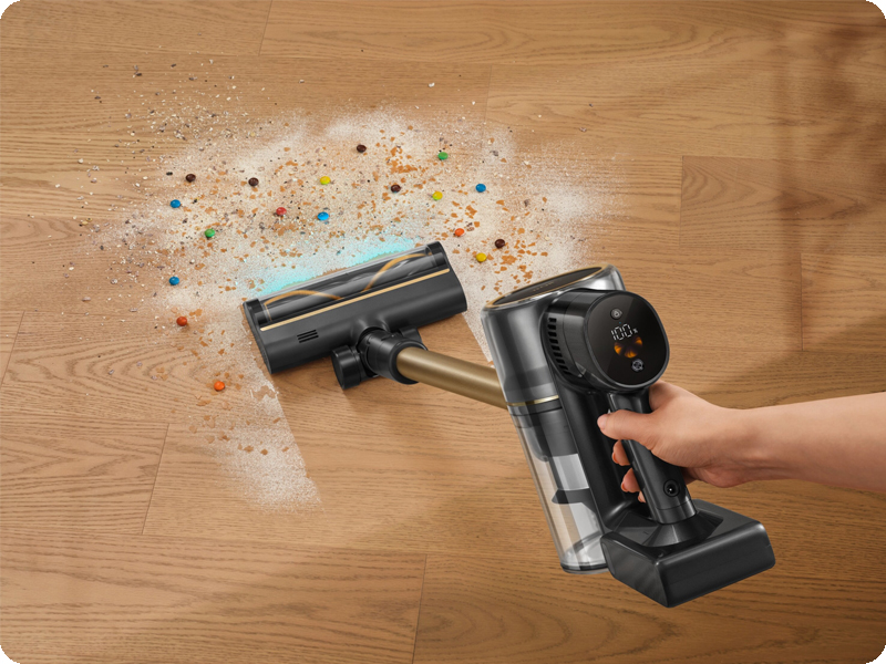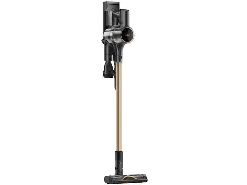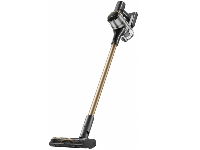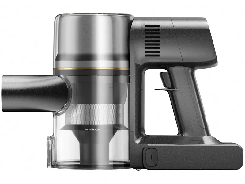 Bezworkowa konstrukcja z pojemnym zbiornikiem 0,6 l pozwala na higieniczne i szybkie opróżnianie bez kontaktu z zabrudzeniami. Wyjmowany akumulator o pojemności 2900 mAh zapewnia nawet 90 minut pracy na jednym ładowaniu, co wystarczy do odkurzenia całego mieszkania. Pełne ładowanie trwa zaledwie 4 godziny, a wskaźniki LED informują o stanie baterii, trybie pracy i poziomie mocy. Urządzenie wyposażono także w możliwość blokady trybu pracy oraz składania na płasko, co ułatwia sprzątanie pod meblami. Złota kolorystyka dodaje elegancji, dzięki czemu odkurzacz prezentuje się wyjątkowo stylowo.