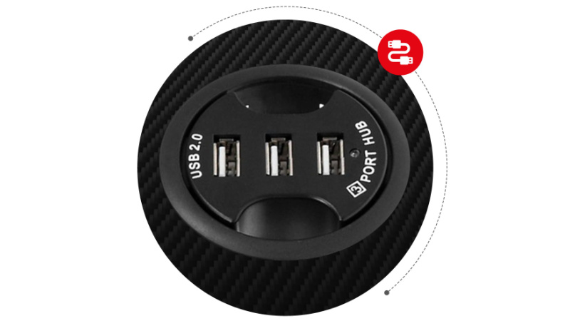 W miejscu tradycyjnych wlotów na przewody umieszczono hub USB z trzema portami USB 2.0 Teraz z łatwością podłączysz pendrive, klawiaturę, mysz, lub inne urządzenia, bez konieczności sięgania za komputer. Specjalna konstrukcja nadal oferuje możliwość poprowadzenia przewodów, zapewniając pełnię funkcjonalności.