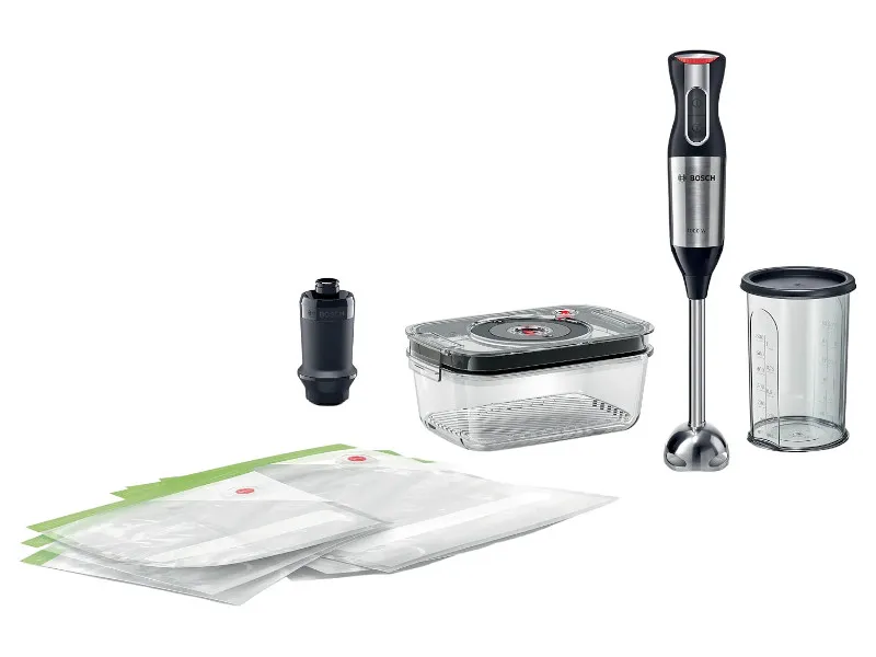Dodatkowo sześć wielorazowych worków próżniowych z suwakiem (3 o pojemności 1,2 l i 3 o pojemności 3,8 l) umożliwia nie tylko przechowywanie, ale również marynowanie czy gotowanie sous-vide. Silnik o mocy 1000 W poradzi sobie nawet z twardymi składnikami, a czteroostrzowy nóż QuatroBlade gwarantuje szybkie i precyzyjne blendowanie. 12-stopniowa regulacja prędkości oraz funkcja Turbo pozwalają dopasować moc do rodzaju potrawy, a technologia AntiSplash minimalizuje rozpryski, utrzymując porządek w kuchni.