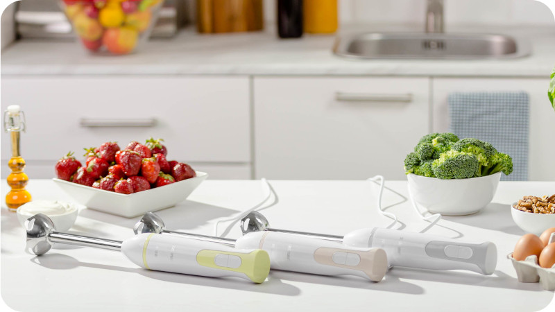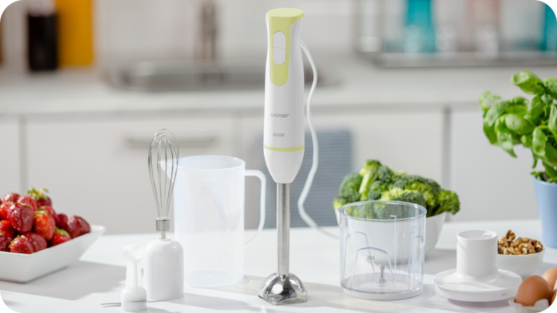 W zestawie z blenderem dostajemy wiele przydatnych i funkcjonalnych akcesoriów, które otwierają nam sporo możliwości kulinarnych. Między innymi metalowa stopa z dwoma nożami zapobiegająca rozpryskiwaniu się jedzenia, a także pojemnik siekający o pojemności aż do 450 ml. Otrzymujemy także przystawkę do ubijania którą można zdemontować i umyć w prosty sposób bez większego wysiłku.