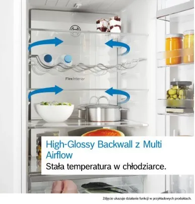 High-Glossy Backwall: błyszcząca ściana tylna z Multi Airflow to równomierne rozprowadzanie chlodnego, świeżego powietrza, aby utrzymać stałą temperaturę wewnątrz chłodziarki.