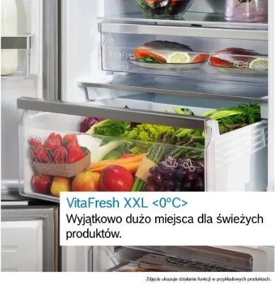 Przestronna strefa VitaFresh XXL oferuje idealne warunki do przechowywania świeżej żywności. Utrzymuje temperaturę niższą dla mięsa i ryb oraz zapewnia wyjątkową świeżość owocom i warzywom w szufladzie z perfekcyjnie dobranym poziomem wilgotności. Owoce i warzywa dzięki odpowiednim warunkom będą w dobrej kondycji zachowując cenne witaminy i pozostaną świeże na dłuższy czas. Więcej jedzenia, mniej marnowanego jedzenia!