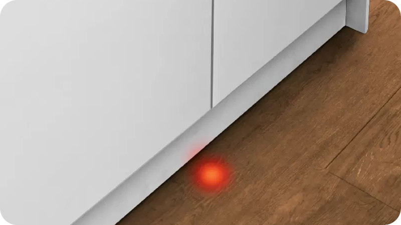 Aktywność zmywarki sygnalizuje czerwona wiązka światła emitowana na podłogę podczas pracy urządzenia. Po zakończeniu programu światło automatycznie gaśnie. Dzięki temu nie trzeba uchylać drzwi urządzenia, aby sprawdzić czy zmywarka zakończyła pracę.