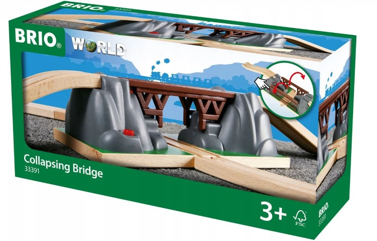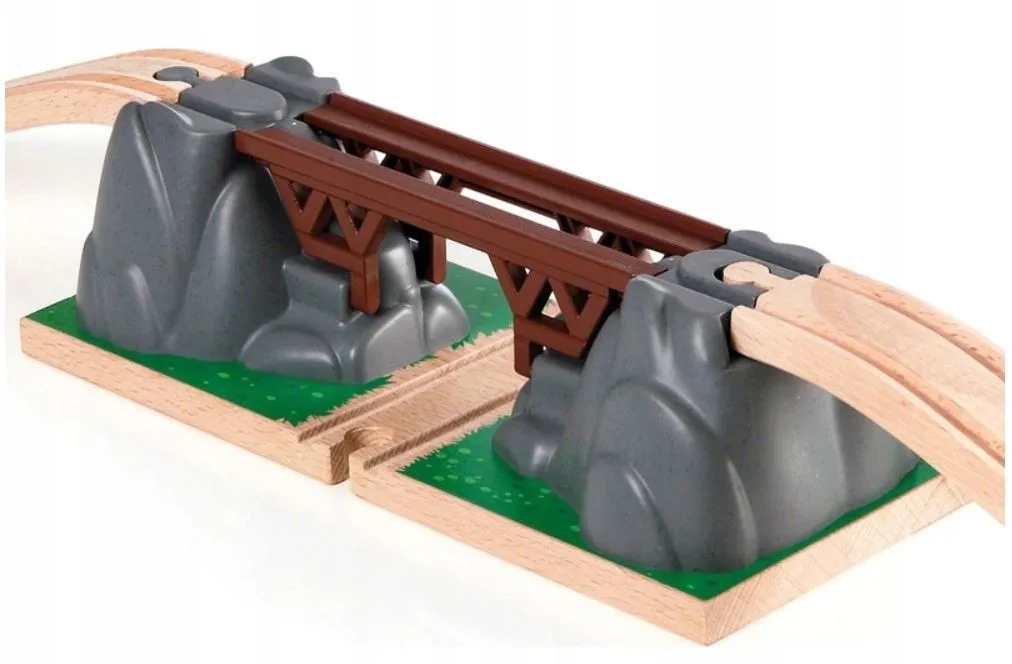 Most z zapadnią, położony pomiędzy dwiema skałami, z wbudowanym automatycznym mechanizmem. Naciśnięcie czerwonego przycisku u podstawy mostu powoduje jego zapadnięcie się: tory poprowadzone na moście rozsuwają się i opadają na tor poprowadzony dołem. Zbuduj trasę kolejową z użyciem wiaduktu i ciesz się jazdą nad i pod kolejowym mostem. Skorzystaj z dołączonych do zestawu dwóch torów wznoszących, aby podjechać w górę do wiaduktu i zjechać z niego w dół. Zestaw jest w pełni kompatybilny z innymi elementami z serii Brio World.