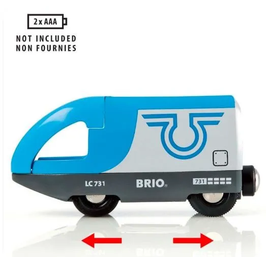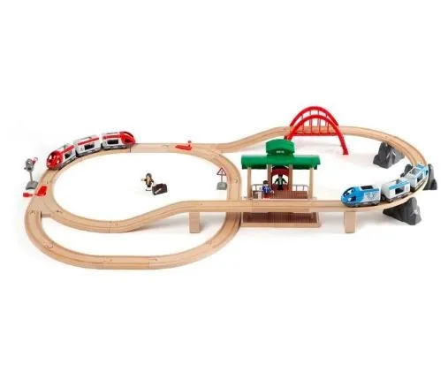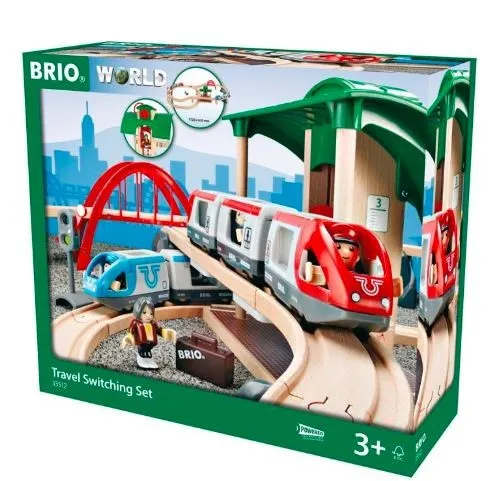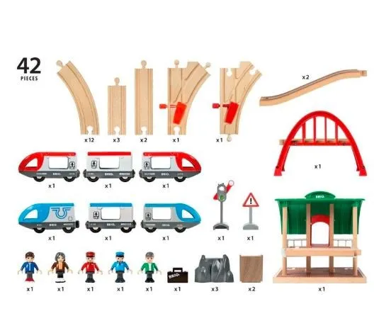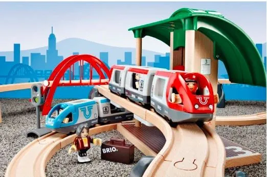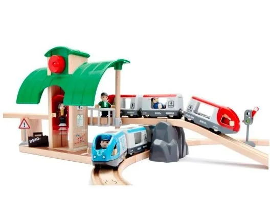 Zestaw Transport Pasażerski to bardzo rozbudowana propozycja od firmy BRIO. Trasa torów częściowo biegnie na podwyższeniu, pokonując w jednym miejscu most. W dwóch miejscach mamy rozjazdy zaopatrzone w mechaniczne zwrotnice. Dzięki plastikowej wkładce możemy ręcznie zmienić tor pociągu. Centralnym elementem zestawu jest piętrowa stacja kolejowa zaopatrzona w windę osobową sterowaną pokrętłem. Na ścianie dworca namalowane są oznaczenia peronu oraz mapa sieci komunikacyjnej. W zestawie znajdują się również dwa pociągi pasażerskie. Pierwszy z nich koloru czerwonego, składa się z 3 połączonych magnesami modułów. Do każdego z wagoników można włożyc figurki pasażerów. Drugi z pociągów - niebieski, jest zasilany bateriami, może jeździć do przodu i do tyłu, jak również przewozić figurki. Zestaw zawiera 42 elementy, m.in.: 2 pociągi osobowe, Dworzec, Most, Znaki drogowe, Zwrotnice, 5x Figurki ludzików, Tory, skalne podpory, walizka.