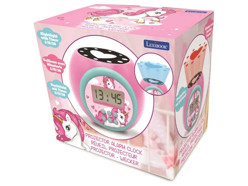 Wyjątkowy budzik dla dzieci ozdobiony grafiką popularnych postaci Jednorożców, Starannie dobrana grafika i wysokiej jakości wykonanie, sprawiają, że urządzenie doskonale wkomponuje się w wystrój dziecięcego pokoju. Budzik został wyposażony w projektor, który może świecić w 3 różnych kolorach, aby stworzyć niesamowitą atmosferę w nocy. Dodatkowo timer w trzech przedziałach czasowych (wyłączenie po 5, 10 oraz 15 min) pozwoli Twojemu dziecku zasnąć bez strachu przed ciemnością. Budzik zasilany jest 3 bateriami AAA (brak w zestawie).