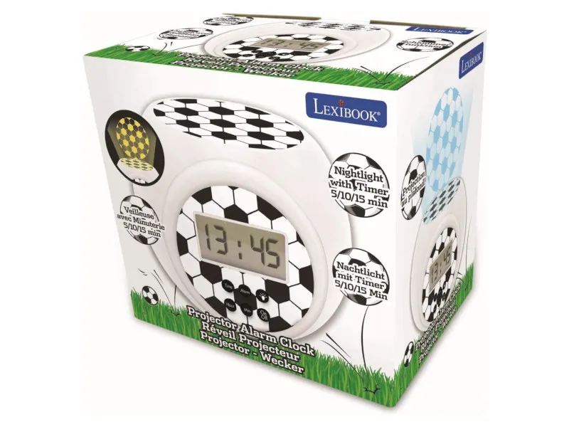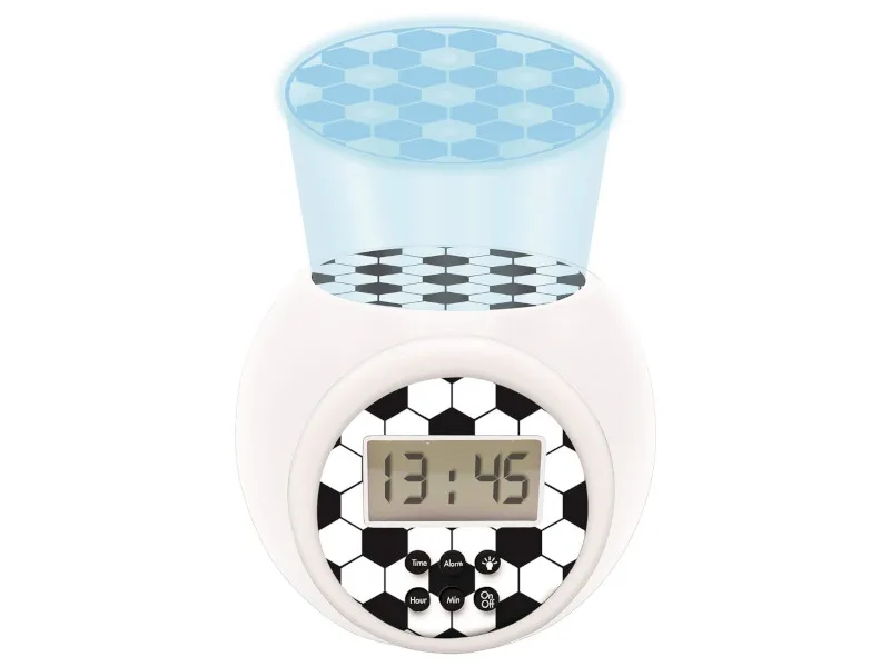 Wyjątkowy budzik dla dzieci ozdobiony grafiką piłki, Starannie dobrana grafika i wysokiej jakości wykonanie, sprawiają, że urządzenie doskonale wkomponuje się w wystrój dziecięcego pokoju. Budzik został wyposażony w projektor, który może świecić w 3 różnych kolorach, aby stworzyć niesamowitą atmosferę w nocy. Dodatkowo timer w trzech przedziałach czasowych (wyłączenie po 5, 10 oraz 15 min) pozwoli Twojemu dziecku zasnąć bez strachu przed ciemnością. Budzik zasilany jest 3 bateriami AAA (brak w zestawie).