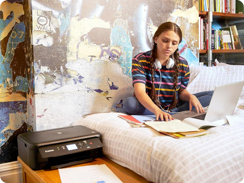 PIXMA TS5150 drukuje z prędkością do 13 stron na minutę w czerni oraz do 6,8 strony na minutę w kolorze. Automatyczny druk dwustronny zwiększa wygodę i pozwala oszczędzać papier. Dwa podajniki papieru – kasetowy i tylna tacka – mieszczą łącznie do 100 arkuszy. Urządzenie obsługuje papier zwykły, fotograficzny oraz koperty, a także druk bez marginesów. Dzięki temu z łatwością przygotujesz zarówno dokumenty, jak i estetyczne wydruki zdjęć.