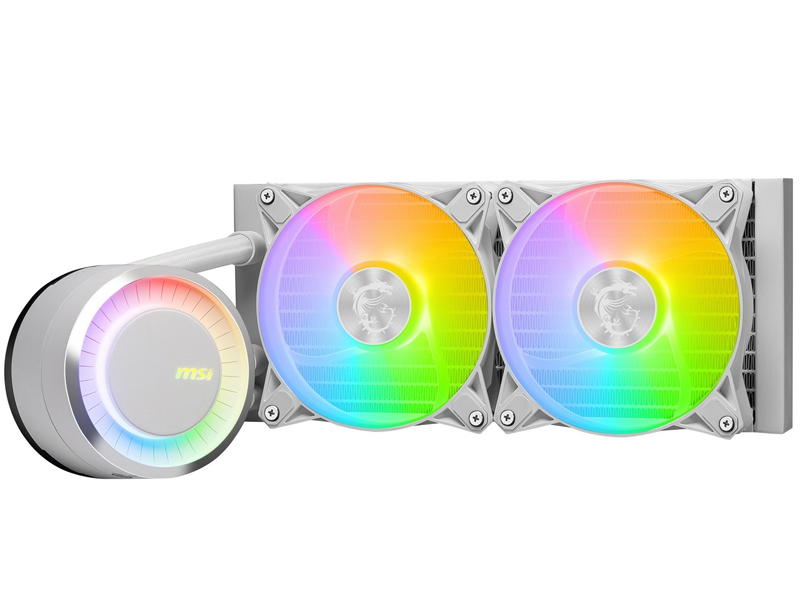 Położenie zainspirowanej zaćmieniem słońca, ręcznie obracanej do 270°, głowicy bloku wodnego z systemem podświetlenia ARGB i z logo MSI może być dostosowane do dowolnej, montażowej orientacji przestrzennej systemu chłodzenia wynikającej z ułożenia podzespołów wewnątrz obudowy komputera. Efekty świetlne generowane przez oświetlenie ARGB głowicy bloku wodnego oraz wentylatora systemu chłodzenia możesz spersonalizować za pomocą narzędzi Mystic Light dostępnych w oprogramowaniu MSI Center.