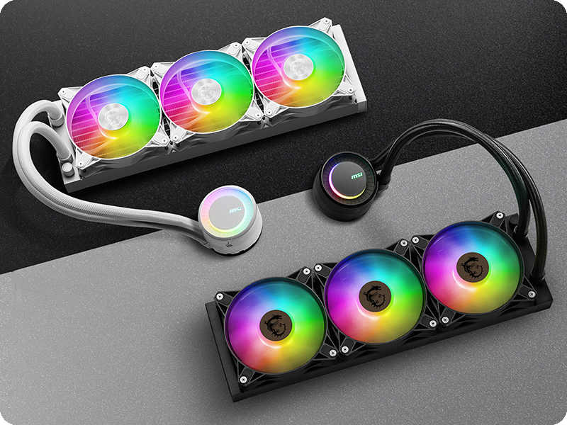 Położenie zainspirowanej zaćmieniem słońca, ręcznie obracanej do 270°, głowicy bloku wodnego z systemem podświetlenia ARGB i z logo MSI może być dostosowane do dowolnej, montażowej orientacji przestrzennej systemu chłodzenia wynikającej z ułożenia podzespołów wewnątrz obudowy komputera. Efekty świetlne generowane przez oświetlenie ARGB głowicy bloku wodnego oraz wentylatora systemu chłodzenia możesz spersonalizować za pomocą narzędzi Mystic Light dostępnych w oprogramowaniu MSI Center.