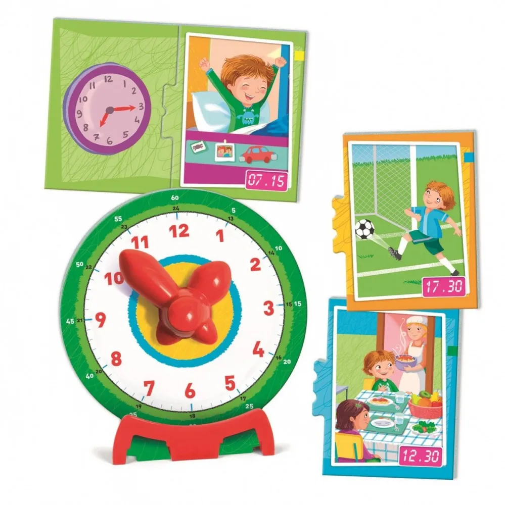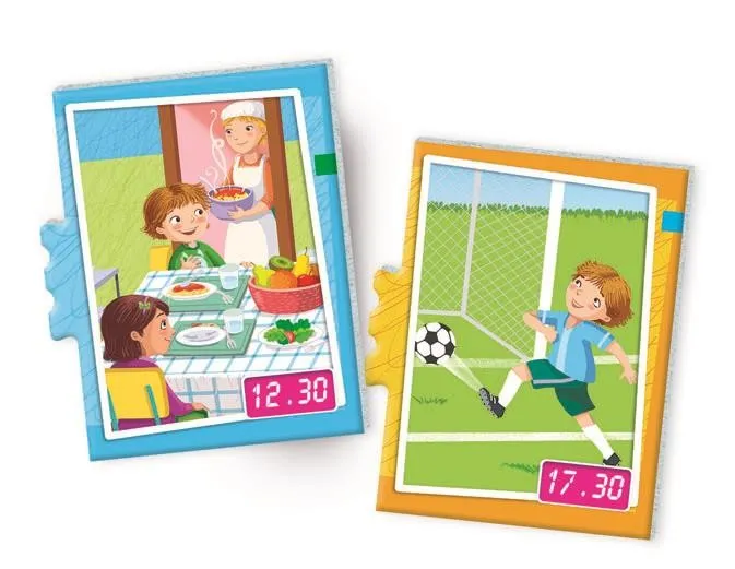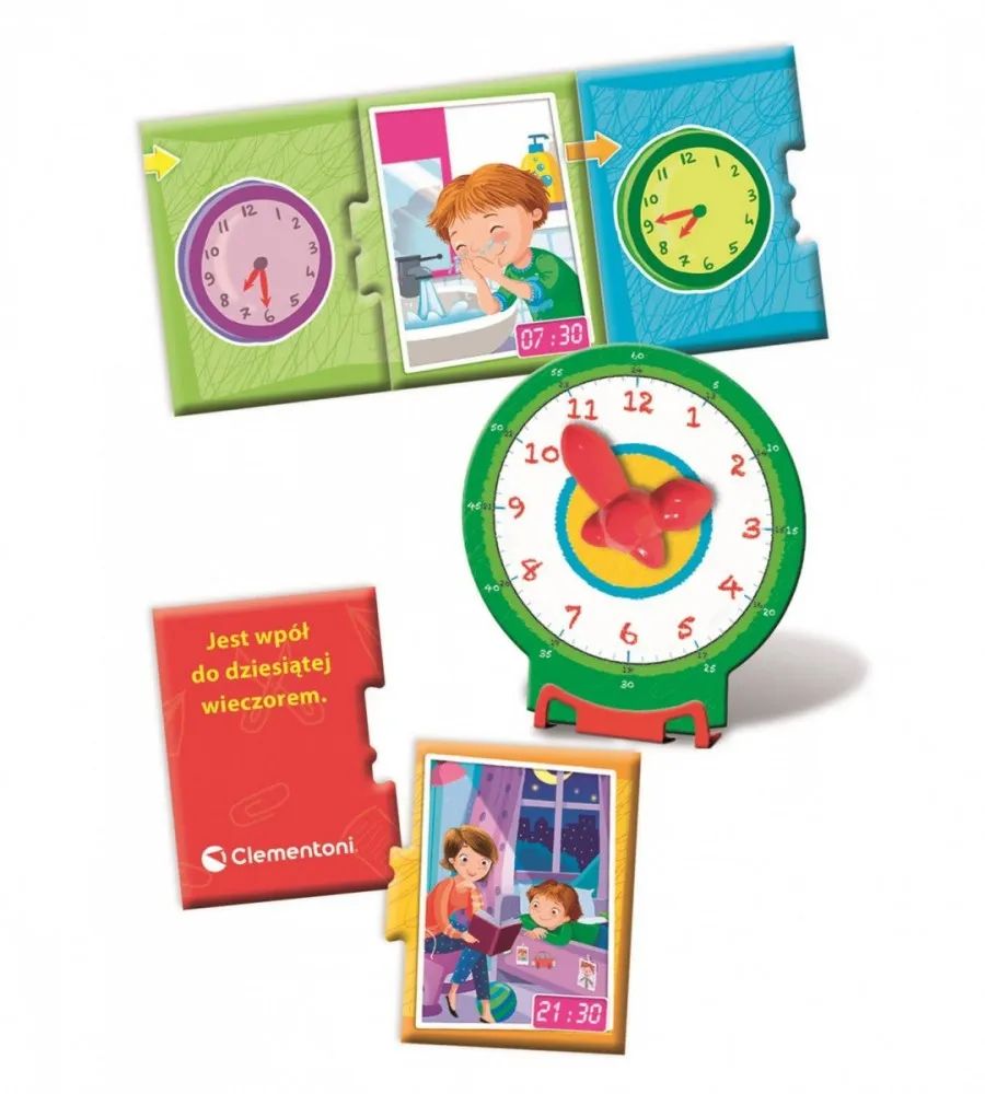 Fantastyczna zabawka, która pozwala w przyjemny sposób nauczyć się korzystania z zegarka. Bawiąc się elementami-puzzlami i dużym zegarem dostarczonym w zestawie, dzieci ćwiczą kojarzenie godzin w formacie analogicznym i cyfrowym z codziennymi czynnościami. Na odwrocie poszczególnych elementów znajda poza tym opis czynności i najpoprawniejszy sposób słownego wyrażenia godziny.