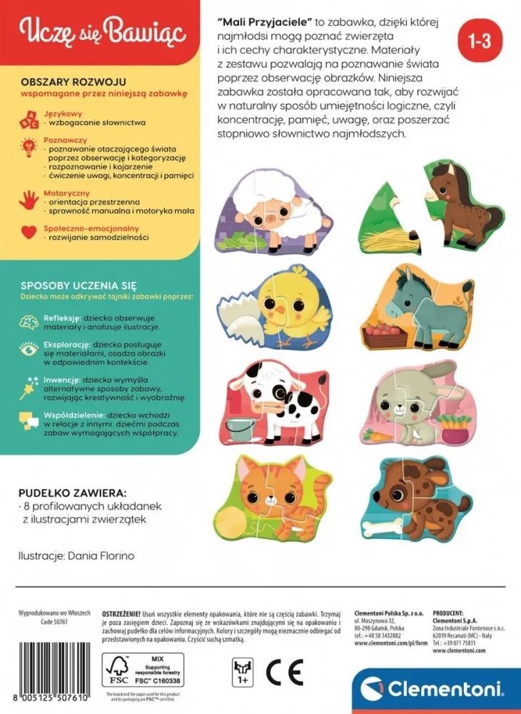 Mali przyjaciele to zabawka, dzięki której najmłodsi mogą poznać zwierzęta i ich cechy charakterystyczne Materiały z zestawu pozwalają na poznawanie świata poprzez obserwacje obrazków. Niniejsza zabawka została opracowana tak, aby rozwijać w naturalny sposób umiejętności logiczne, czyli koncentracje, pamięć, uwagę oraz poszerzać stopniowo słownictwo najmłodszych.