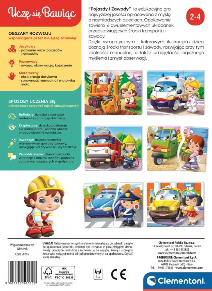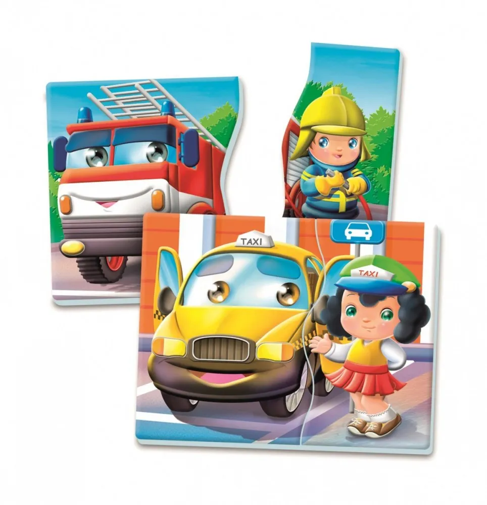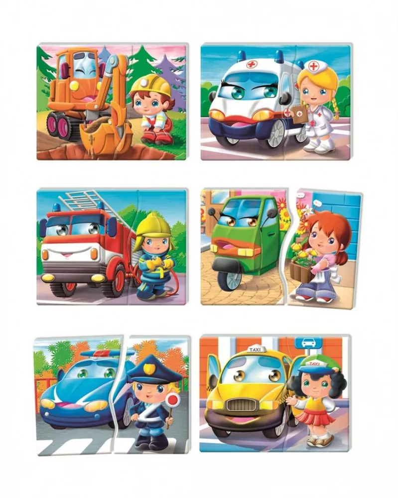 Pojazdy i Zawody to edukacyjna gra najwyższej jakości opracowana z myślą o najmłodszych dzieciach. Opakowanie zawiera 6 dwuelementowych układanek przedstawiających środki transportu i zawody. Dzięki sympatycznym i kolorowym ilustracjom dzieci poznają środki transportu i zawody, rozwijając przy tym zdolności manualne, a także umiejętność logicznego myślenia i zmysł obserwacji.