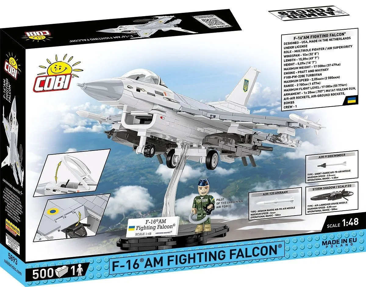 Z 500 najwyższej jakości klocków konstrukcyjnych COBI wybudujesz najpopularniejszy na świecie licencyjny samolot myśliwsko-szturmowy F-16 AM FIGHTING FALCON po raz pierwszy w historii w barwach Ukrainy! Zestaw został starannie zaprojektowany w modelarskiej skali 1:48. Klocki zostały pokryte wysokiej jakości nadrukami. Samolot posiada dwa podwieszone potężne pociski manewrujące Storm Shadow (SCALP-EG), rakiety AIM-9 SIDEWINDER oraz AIM-120 AMRAM. Uzbrojenie jest odpinane i można je dowolnie konfigurować lub umieścić na innych samolotach z kolekcji Armed Forces! Do zestawu dołączona jest figurka ukraińskiego pilota wyposażonego w kask i maskę tlenową z wężykiem. Znajdują się na niej nadruki zawierające flagę Ukrainy patche ukraińskich Sił Powietrznych i pilotów F-16. Całość zestawu uzupełnia klockowa podstawka ekspozycyjna z tabliczką zawierającą nazwę zestawu, flagę narodową oraz logotyp Lockheed Martin.