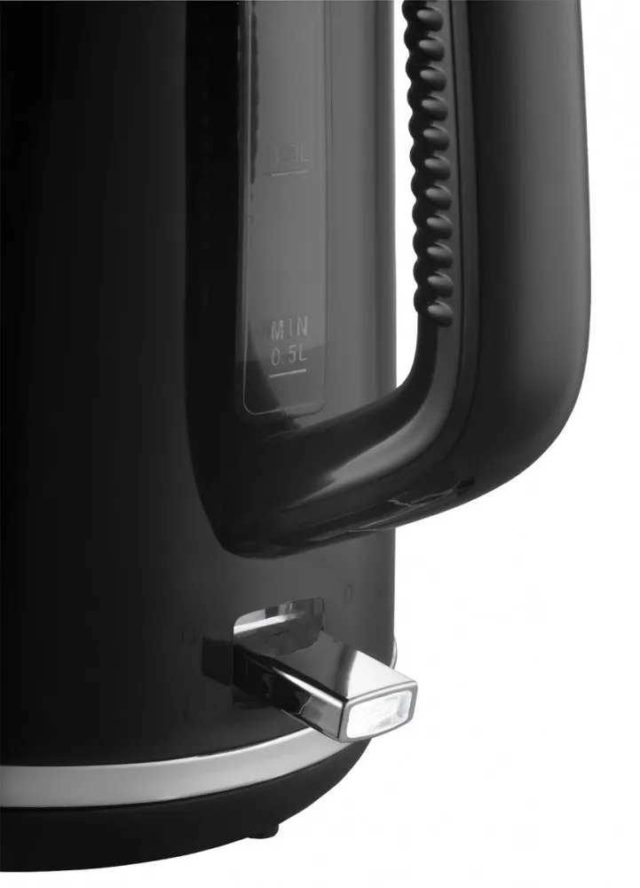 Czajnik wyposażony jest w przycisk umożliwiający łatwe i szybkie otwarcie pokrywy jednym naciśnięciem, co zwiększa komfort użytkownika podczas napełniania wodą. Gładkie dno z ukrytą grzałką zapobiega gromadzeniu się brudu. Duży wskaźnik wody pod uchwytem umożliwia podgląd ilości wody w czajniku. Praktyczna jest także w pełni obrotowa podstawa z miejscem na przechowywanie nadmiaru kabla, na której można ustawić czajnik pod dowolnym kątem.
