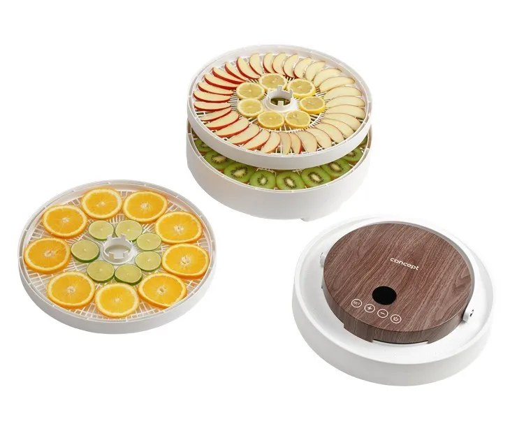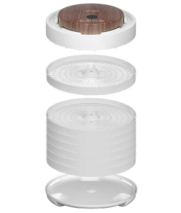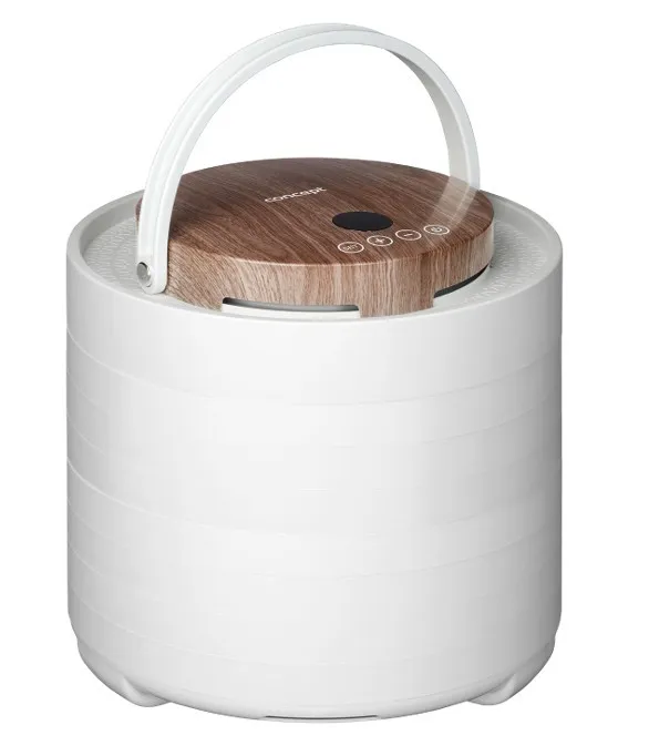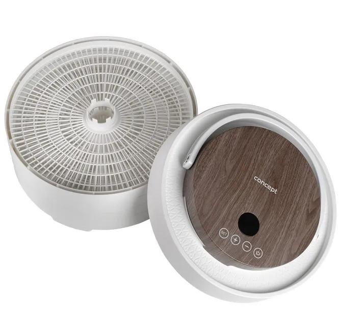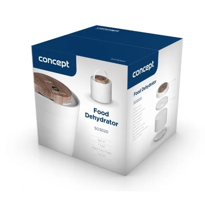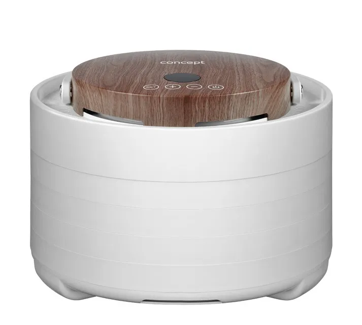 Suszarka do żywności Concept SO3020 zachwyca nowoczesnym designem z pokrywą w eleganckim drewnianym dekorze oraz praktycznym uchwytem ułatwiającym obsługę. Oferuje 7 sit suszących i inteligentne rozwiązanie konstrukcyjne, w którym silnik umieszczony jest bezpośrednio w pokrywie. Dzięki temu jest lepiej chroniony przed uszkodzeniem spowodowanym przez ściekający sok lub resztki żywności, które mogą spadać podczas suszenia. Stylowy wygląd w połączeniu z praktycznymi detalami sprawia, że suszarka jest nie tylko funkcjonalnym, ale również estetycznym urządzeniem w każdej kuchni.