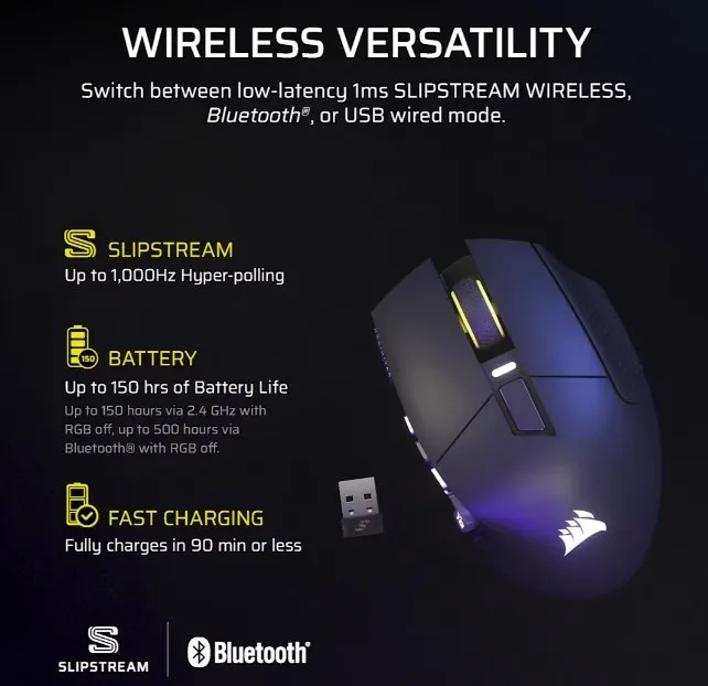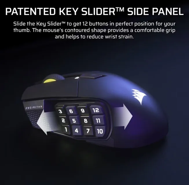 Dzięki 16 programowalnym przyciskom, regulowanemu panelowi Key Slider, zadziwiająco dokładnemu czujnikowi MARKSMAN S 33K i technologii SLIPSTREAM WIRELESS o bardzo niskim poziomie opóźnień mysz do gier MMO CORSAIR SCIMITAR ELITE WIRELESS SE jest legendarnym sprzętem do gier MMO.