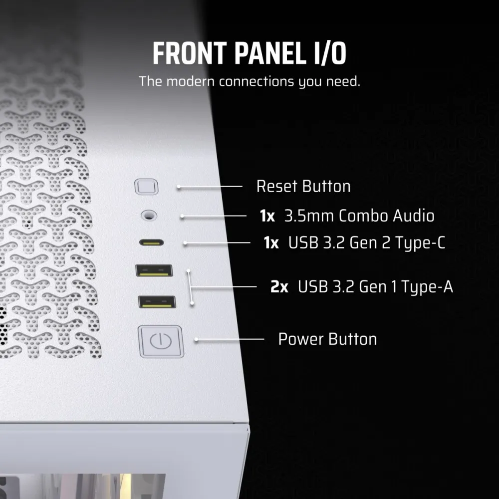 1 x USB 3.1 Typ C, Power, Reset, 2 x USB 3.0, 1 x mikrofon/słuchawki (combo)