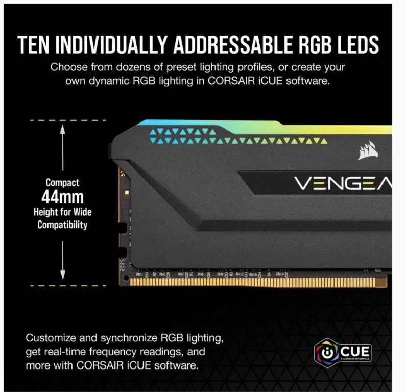 Pamięć CORSAIR VENGEANCE RGB PRO SL DDR4 rozświetli Twój komputer dynamicznym, indywidualnie adresowanym podświetleniem RGB, zapewniając jednocześnie najwyższą wydajność w kompaktowych modułach pamięci o wysokości 44 mm.