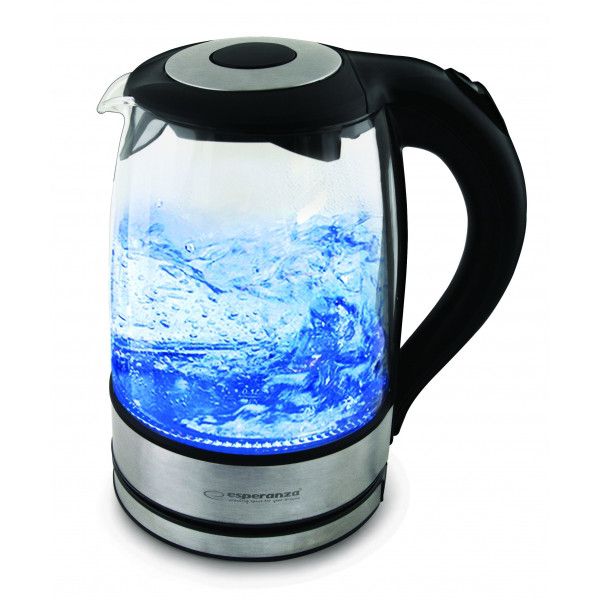 Szklany, bezprzewodowy czajnik elektryczny posiada podświetlenie diodami LED podczas gotowania wody. Unikalny, ponadczasowy kształt i piękna niebieska poświata gotującej się wody pasują do każdego wnętrza i wystroju kuchni.