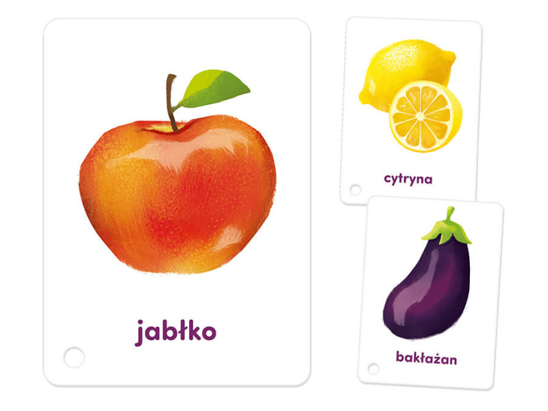 Obrazkowe karty z ilustracjami owoców i warzyw zawierają odpowiednią dla dziecka liczbę szczegółów. Baw się z dzieckiem nazywając kolory, kształty, zapachy i smaki. Pokazuj paluszkiem na wybrane elementy i ucz nowych słów. Nauka przez zabawę to wspaniały sposób na spędzenie czasu ze swoją pociechą. Niewielkie wymiary książeczki pozwalają na zabranie jej w podróże i na spacery, a poręczne kółeczko umożliwia połączenie wszystkich kart w jeden stosik.