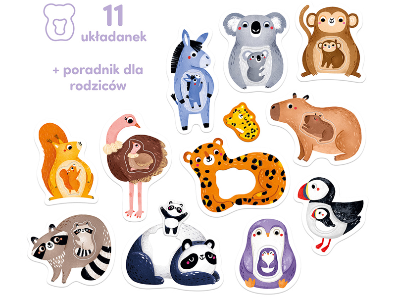 W zestawie znajdziecie 11 dużych dwuelementowych układanek z dziurką. Urocze ilustracje przedstawiają rodziców i maluchy – zabawa polega na dopasowaniu elementu do dziurki. Pozwala to doskonalić małą motorykę, spostrzegawczość i wyobraźnię, a także spędzać razem wyjątkowe chwile!