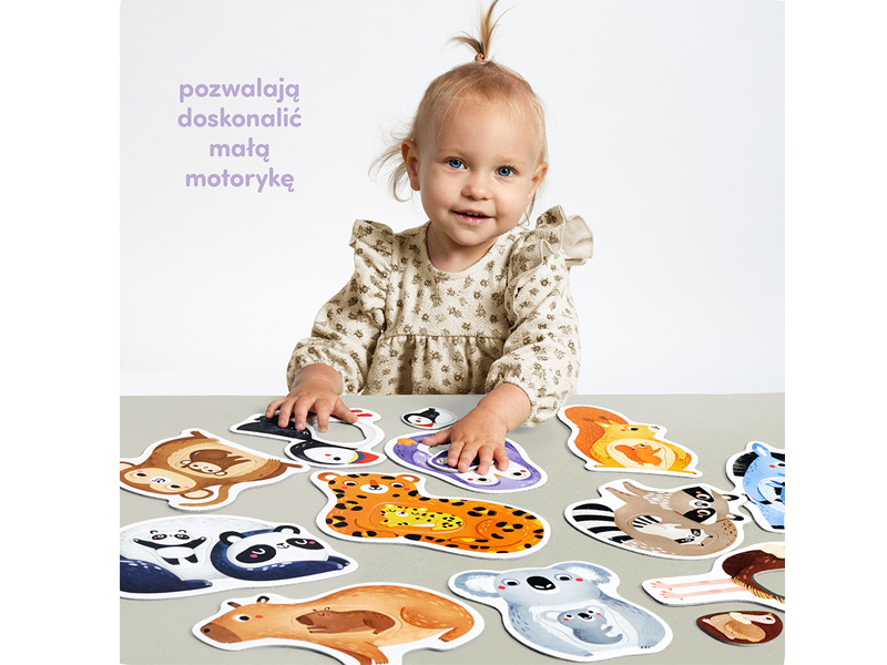 Pierwsze puzzle Mama i ja to wyjątkowy zestaw edukacyjny dla najmłodszych odkrywców i rewelacyjny pomysł na pierwsze układanki. Składa się z 11 dużych 2-elementowych puzzli z dziurką. Zabawa polega na dopasowywaniu elementów o różnych kształtach do dziurek. Zwierzątka to jeden z najulubieńszych tematów maluchów. Urocze ilustracje inspirują do mnóstwa wszechstronnie rozwijających zabaw. Pomysły na nie znajdziecie w poradniku dołączonym do zestawu.