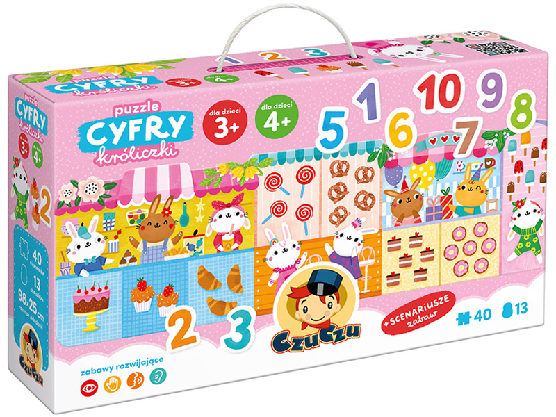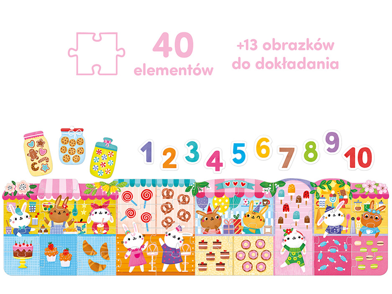 Zobaczcie, co przygotowały króliczki! Ułóżcie 40-elementowe duże puzzle i policzcie wszystkie smakołyki. Poznajcie kształty cyfr i ich znaczenie. Dołóżcie elementy z liczbami i kolorowe słoiczki – dajcie się ponieść wyobraźni. Układanie puzzli to wszechstronnie rozwijająca zabawa, a ten zestaw inspiruje do poznawania cyfr, liczenia do 10… i mnóstwa innych wesołych aktywności!