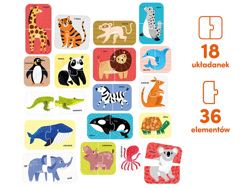 Przedstawiamy dwuelementowe puzzle z dzikimi zwierzętami dla najmłodszych odkrywców. Edukacyjny zestaw składa się z 18 dużych układanek. Znakomicie sprawdzą się jako pierwsze puzzle z tradycyjnymi łączeniami lub kolejny zestaw w kolekcji. Piękne ilustracje przedstawiają dzikie zwierzątka z różnych zakątków globu. Maluchy je uwielbiają! Zabawa z puzzlami pozwala rozwijać koordynację ręka-oko, bystre oko i inspiruje do poznawania nowych słów i zdobywania wiedzy. Dzika zabawa start!
