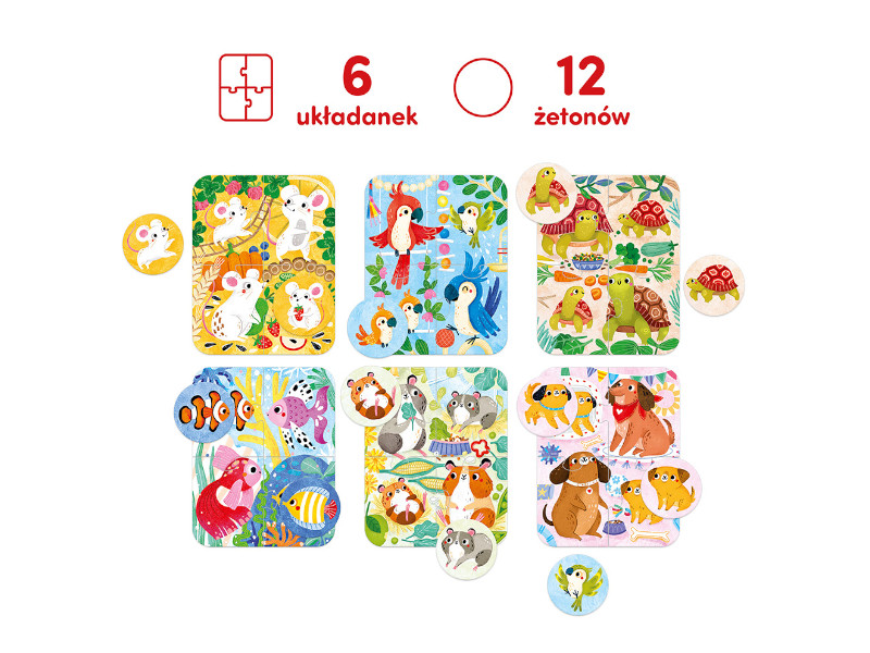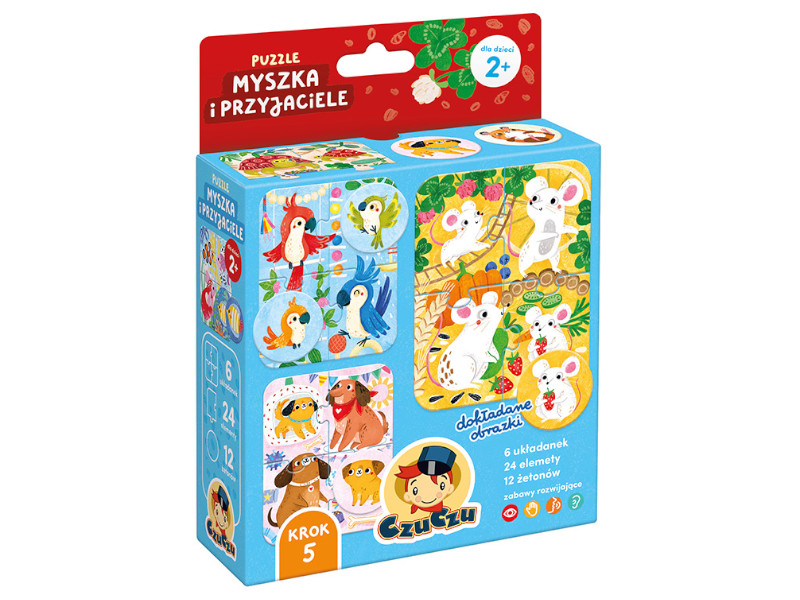 Hej, maluchy! Czas na kolejny krok puzzlowej przygody oraz pierwsze rozgrywki. Zestaw Puzzle Myszka i przyjaciele to doskonały pomysł na trudniejsze puzzle oraz pierwszą grę dla dzieci. W komplecie znajduje się 6 czteroelementowych puzzli przedstawiających kolorowe scenki ze zwierzątkami domowymi, takimi jak myszki, pieski, rybki, chomiki, żółwie i papużki, oraz 12 kółeczek – po 2 do każdej układanki. Układanie puzzli rozwija małą motorykę, bystre oko i cierpliwość, a różne kolory rewersów ułatwiają sortowanie i stopniowanie trudności. Ułożone scenki mogą służyć jako plansze do gry w CzuCzulotto, gdzie dzieci dopasowują kółeczka do swoich puzzli, grając na czas lub w systemie memory. Puzzle inspirują do nauki nowych słów, nazywania zwierzątek, ich kolorów i detali, a także do tworzenia własnych opowieści. Zabawa stymuluje kreatywność, rozwija aparat mowy poprzez wydawanie odgłosów zwierząt i zachęca do ruchu, naśladując bohaterów ilustracji. Zestaw można również wykorzystać do rysowania własnych zwierzątek, co czyni zabawę jeszcze bardziej wszechstronną i rozwijającą. Puzzle Myszka i przyjaciele to zestaw edukacyjny, który łączy naukę i zabawę, zapewniając dziecku radość, rozwój i kreatywne spędzanie czasu.