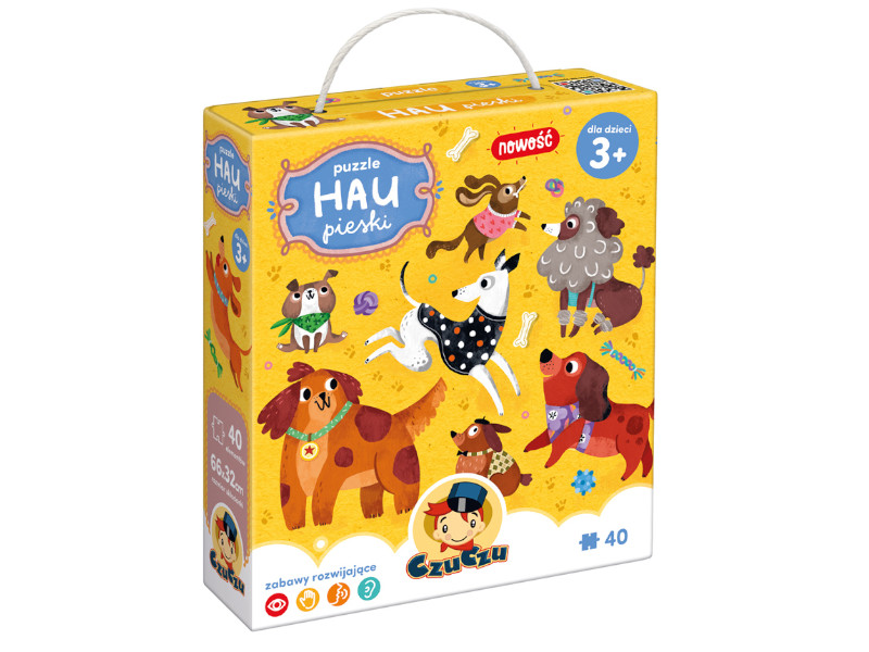 Twoje dziecko fascynuje się czworonogami i wciągającymi puzzlami? Chce zdobywać coraz to nową wiedzę co do otaczającego świata? Puzzle przedstawiające pieski z serii HAU to idealny sposób, aby mu pomóc! Te 40 elementowe puzzle to niezwykła ilustracja przedstawiająca różnego rodzaju gatunki psów. Jest to świetna zabawa, która pobudza wyobraźnie oraz pasję, a przy tym może być także idelanym sposobem na rodzinne spędzanie czasu.