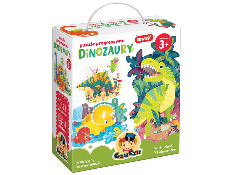 Dziecko rozwija się od najwcześniejszych etapów życia, dlatego warto zadbać o jego rozwój w najlepszy sposób. Pomóc mogą w tym Puzzle CzuCzu, które przeznaczone są dla dzieci, które ukończyły 3 latka. Zestaw składa się z 4 układanek, które wspomogą rozwój manualny Twojego dziecka. Zabawa polega na dopasowaniu do siebie elementów tworzących wspólnie różne dinozaury. Puzzle progresywne zawierają bardzo łatwe, jak i trudniejsze układanki, do których maluch będzie stopniowo docierał. Zademonstruj maluchowi, które kształty pasują do siebie oraz opowiadaj co znajduje się na ilustracjach.