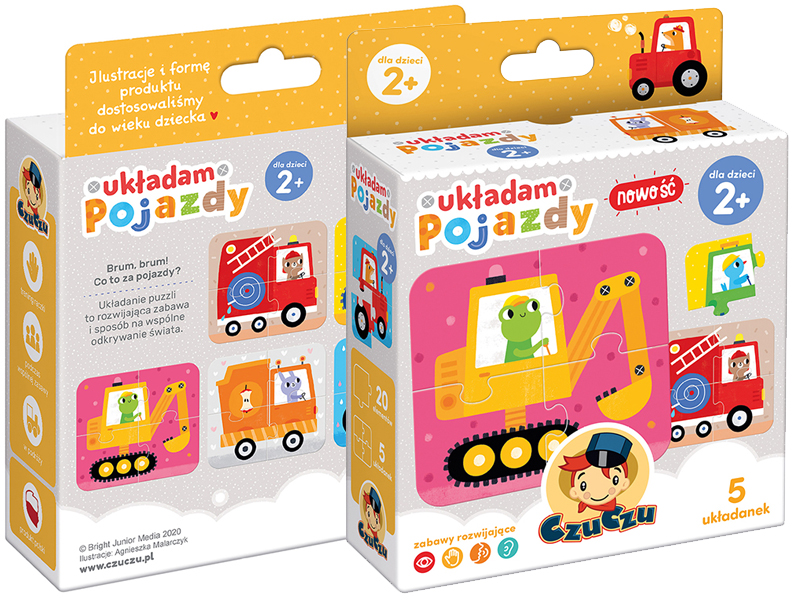 Dziecko rozwija się od najwcześniejszych etapów życia, dlatego warto zadbać o jego rozwój w najlepszy sposób. Pomóc mogą w tym puzzle Układam Pojazdy, które przeznaczone są dla dzieci, które ukończyły 2 rok życia. Zestaw składa się z 5 dużych, czteroelementowych układanek, które wspomogą rozwój manualny Twojego malucha. Polega ona na ułożeniu puzzli przedstawiających pojazdy. Zademonstruj dziecku w jaki sposób ułożyć puzlle oraz opowiadaj co znajduje się na ilustracjach.