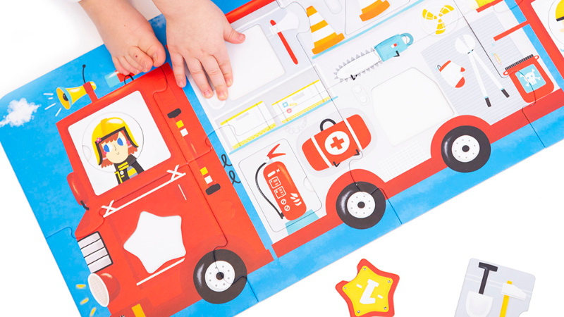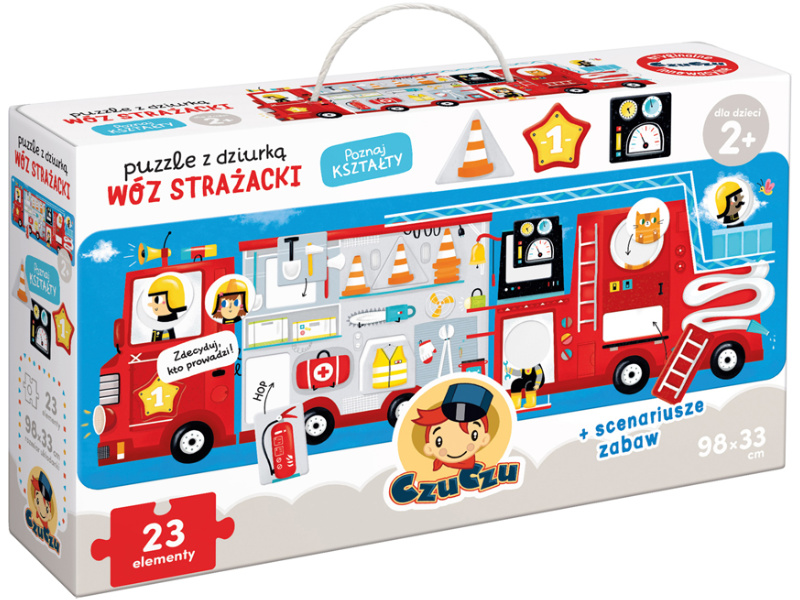 Edukacyjne puzzle CzuCzu rozwijają wyobraźnię Twojego dziecka. Oprócz tradycyjnych puzzli dostępne są również elementy o różnych kształtach, którymi należy uzupełnik ilustrację. W ten sposób Twoje dziecko może nauczyć się jakie elementy wchodzą w wyposażenie wozu strażackiego. Układanka może bawić i uczyć na wiele sposobów. Układanie puzzli ćwiczy zdolności motoryczne, koncentrację oraz zdolności rozpoznawania kształtów. Łączenie puzzli z ilustracjami inspiruje do tworzenia własnych zabaw, na przykład opowiadania historii o dzielnych strażakach.