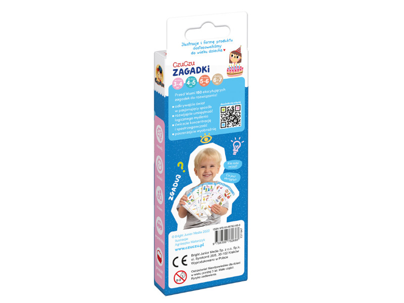 Zagadki umożliwiają dziecku rozwijanie słownictwa i wyobraźni, jednocześnie inspirują je do zadawania nowych pytań. Produkt zaprojektowany został z myślą o dzieciach w wieku od 3 do 4 lat. Kompaktowe rozmiary i poręczna forma pozwala na korzystanie z zagadek, gdzie tylko chcesz. Książeczka idealnie sprawdzi się w miejscach takich jak poczekalnia czy w długiej podróży. Wewnątrz książki znajdziemy aż 150 zabaw i zagadek edukacyjnych, które pozwalają na kreatywne i łatwe poznawanie świata.