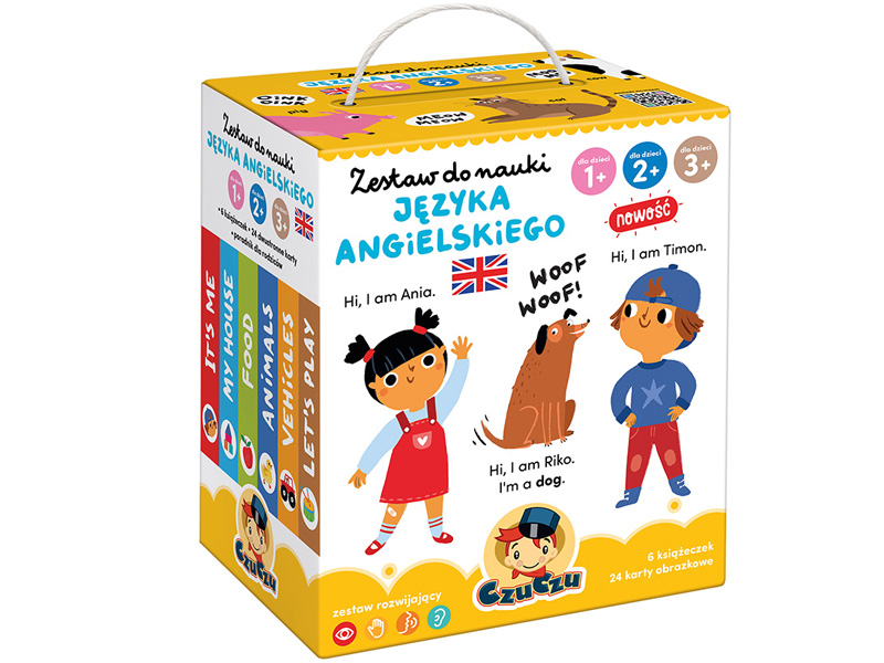 Zestaw sześciu książeczek oraz 24 kart obrazkowych do nauki języka angielskiego przeznaczony jest dla dzieci od 1 roku życia do 3 lat. Ciekawe ilustracje zachęcają do poznawania angielskich słówek, wyrażeń oraz wspólnej lektury. Interesujące zadania angażują wszystkie zmysły, w tym paluszkowe zabawy, które są specjalnymi zadaniami dla paluszków i dłoni, aby łatwiej zapamiętać angielskie wyrażenia. Dodatkowo, do zestawy został dołączony poradnik z wyjaśnieniem zastosowanej metody, a także z pomysłami na edukacyjne zabawy.