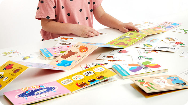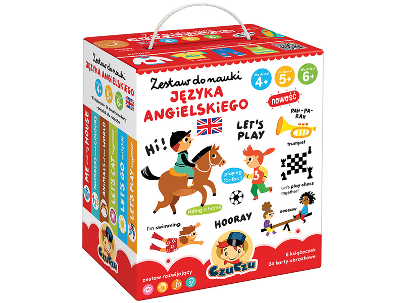 Zestaw sześciu książeczek oraz 24 kart obrazkowych do nauki języka angielskiego przeznaczony jest dla dzieci od 4+. Ciekawe ilustracje zachęcają do poznawania angielskich słówek, wyrażeń oraz wspólnej lektury. Interesujące zadania angażują wszystkie zmysły, w tym paluszkowe zabawy, które są specjalnymi zadaniami dla paluszków i dłoni, aby łatwiej zapamiętać angielskie wyrażenia. Dodatkowo, do zestawy został dołączony poradnik z wyjaśnieniem zastosowanej metody, a także z pomysłami na edukacyjne zabawy.