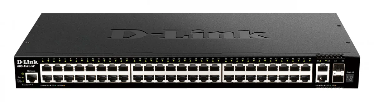 Możliwość stakowania do ośmiu przełączników DGS-1520 przy użyciu miedzianych portów 10GBASE-T i / lub światłowodowych SFP+. Wsparcie stakowania hybrydowego zwiększa możliwości i obniża koszt okablowania dzięki zastosowaniu miedzi zamiast światłowodu.