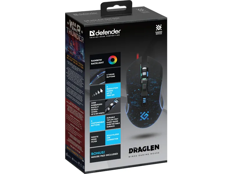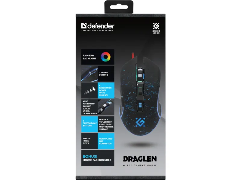 Defender Draglen to profesjonalna i funkcjonalna mysz stworzona tak, aby zadowolić nawet najbardziej wymagających graczy. Precyzyjny sensor optyczny z rozdzielczością 7200 DPI umożliwi ci dokładne pozycjonowanie kursora w grach. Mysz od Defender z pewnością będzie doskonałym narzędziem i dostarczy ci niezapomnianych wrażeń nawet podczas nawet wielogodzinnych zmagań z komputerem. Mysz została przeznaczona i skonstruowana specjalnie dla graczy.