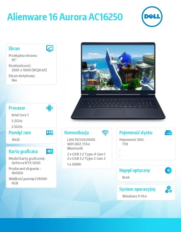 Opis dotyczy serii notebooków Alienware 16 Aurora AC16250. Rzeczywiste cechy mogą się różnić w zależności od konfiguracji notebooka.
