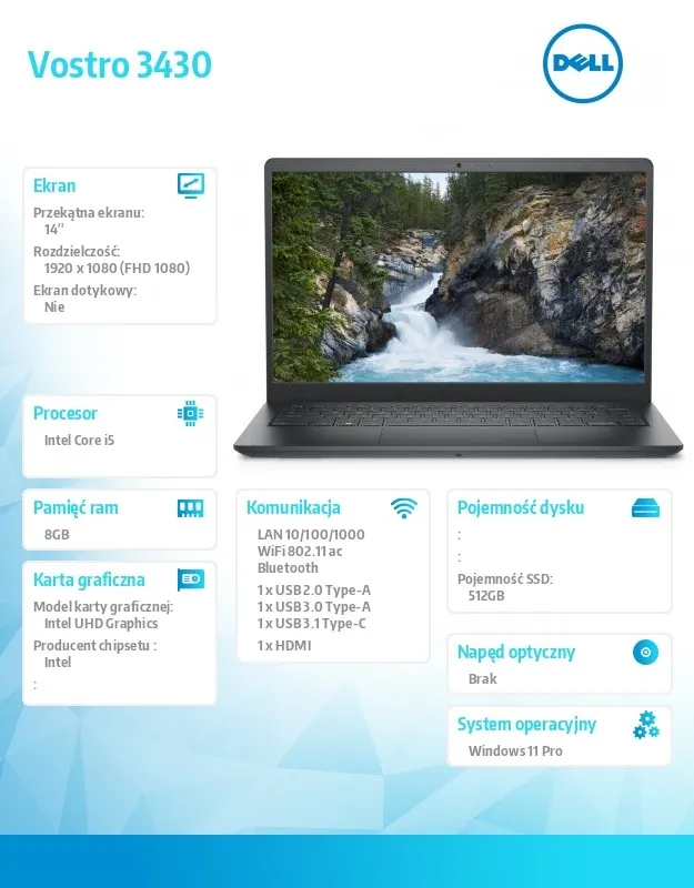 Opis dotyczy serii notebooków Vostro 3430. Rzeczywiste cechy mogą się różnić w zależności od konfiguracji notebooka.