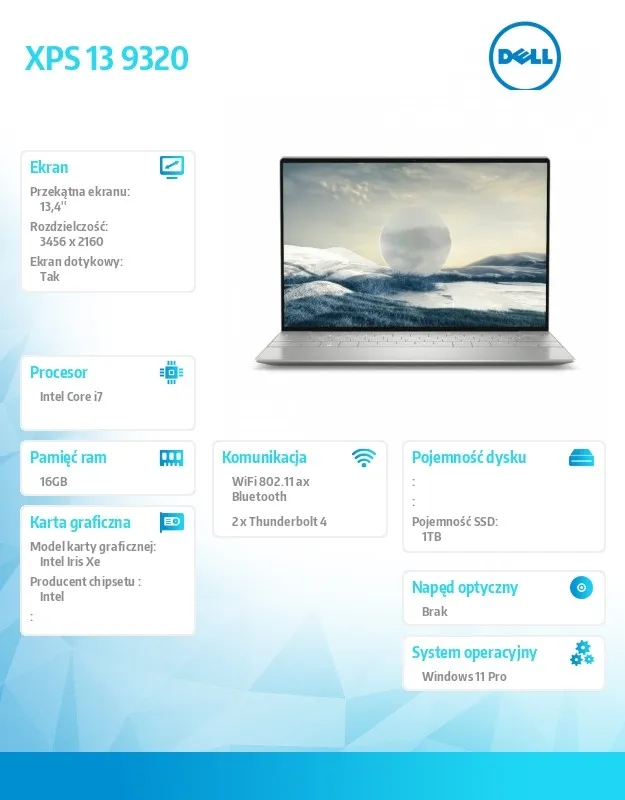 Dell Notebook XPS 13 9320 Win11Pro i7-1360P/SSD 1TB/16GB/Intel Iris Xe/13.4 OLED/Backlit/Platinum/2Y NBD