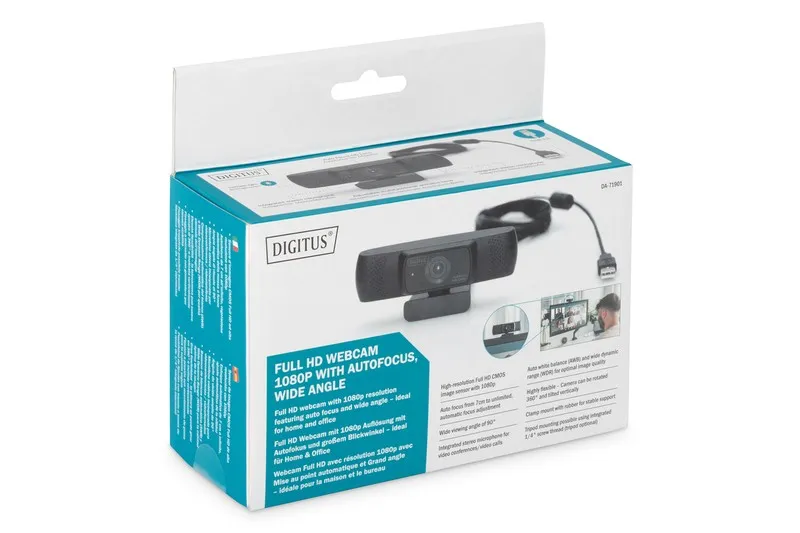 Wysokiej rozdzielczości kamera internetowa DIGITUS Full HD z autofokusem zapewnia zawsze krystalicznie czysty obraz. Przy 30 klatkach na sekundę zapewnia płynny strumień, który zawsze jest prezentowany we właściwym świetle dzięki automatycznemu balansowi bieli (AWB) i szerokiemu Wide Dynamic Range (WDR). Zakres automatycznego ustawiania ostrości zaczyna się od 7 cm i nie ma żadnego ograniczenia. Dzięki zintegrowanemu mikrofonowi stereo będziesz doskonale przygotowany do prowadzenia rozmów telefonicznych z wideo, wideokonferencji i zamieszczania postów w mediach społecznościowych. Instalacja na monitorze jest bardzo prosta, można użyć gumowanego uchwytu zaciskowego lub opcjonalnie zintegrowanego gwintu śrubowego 1/4 cala, na przykład w przypadku ministatywów. Kamerę internetową można obracać w poziomie o 360°, a także odchylać w górę i w dół, dzięki czemu można ją optymalnie ustawić w dowolnej pozycji na biurku lub monitorze. Kamera internetowa DIGITUS Full HD jest idealna do zastosowań domowych i biurowych oraz łatwa w użyciu wystarczy ją podłączyć i używać (Plug and Play).
