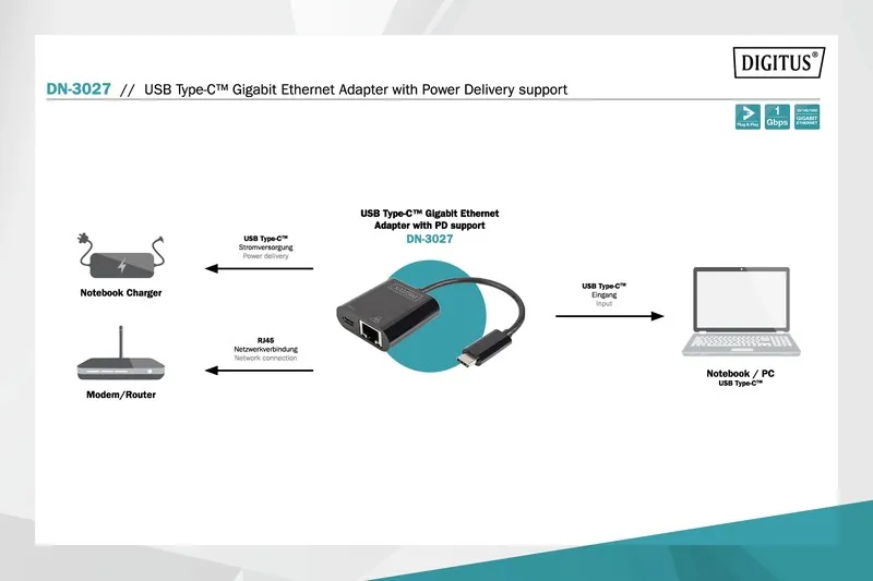 Digitus Karta sieciowa przewodowa USB 3.0 Typ C do RJ45 Gigabit Ethernet oraz 1xUSB Typ C z PD 2.0
