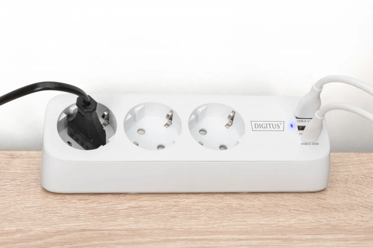 Komputery i podzespołyPodzespołyZasilaczeListwy zasilająceDigitus Listwa zasilająca biurkowa, 3 gniazda Schuko, 2x USB-A (2x 12W), 1x USB-C (30W) z zaciskiem na blat, kabel 1,5m, biała
