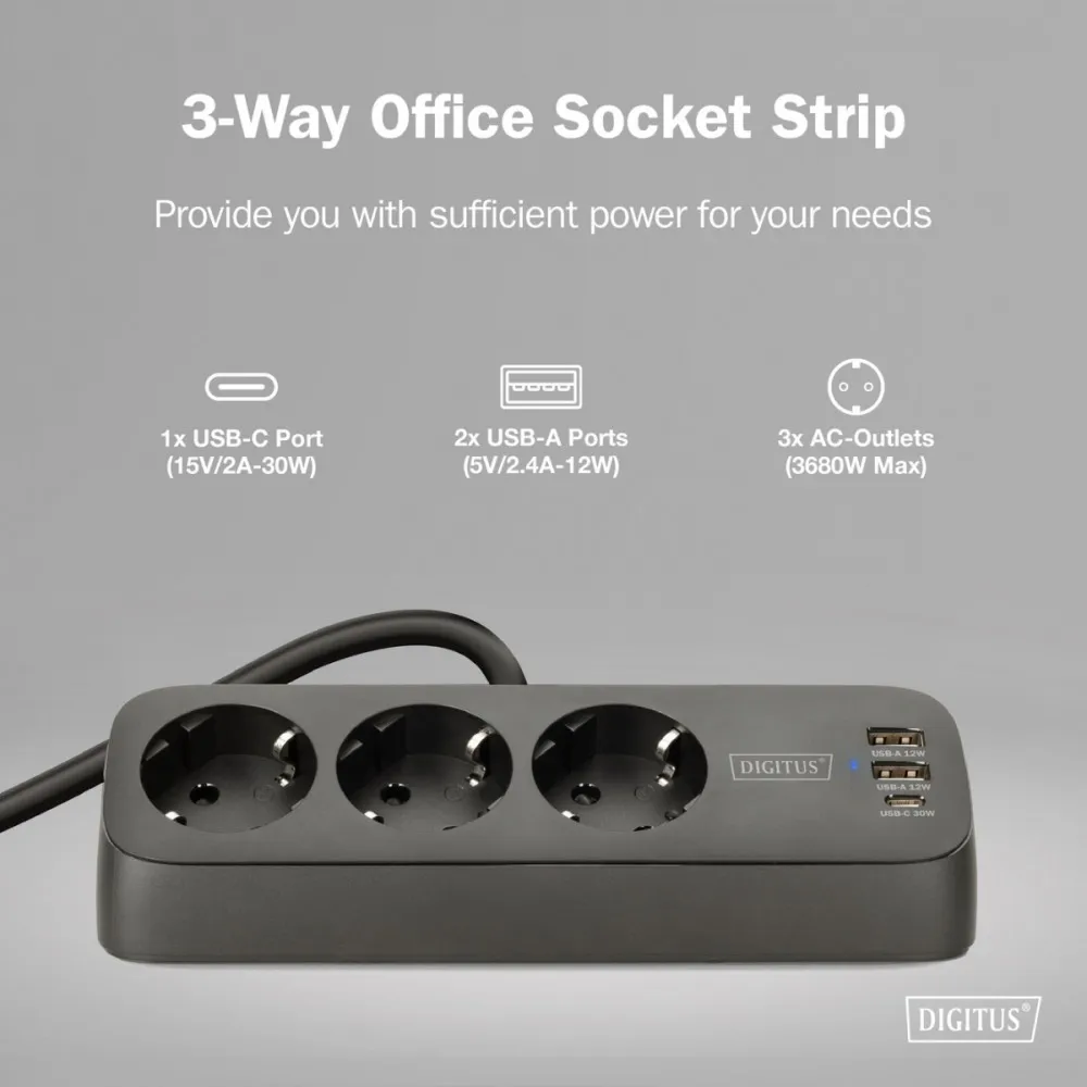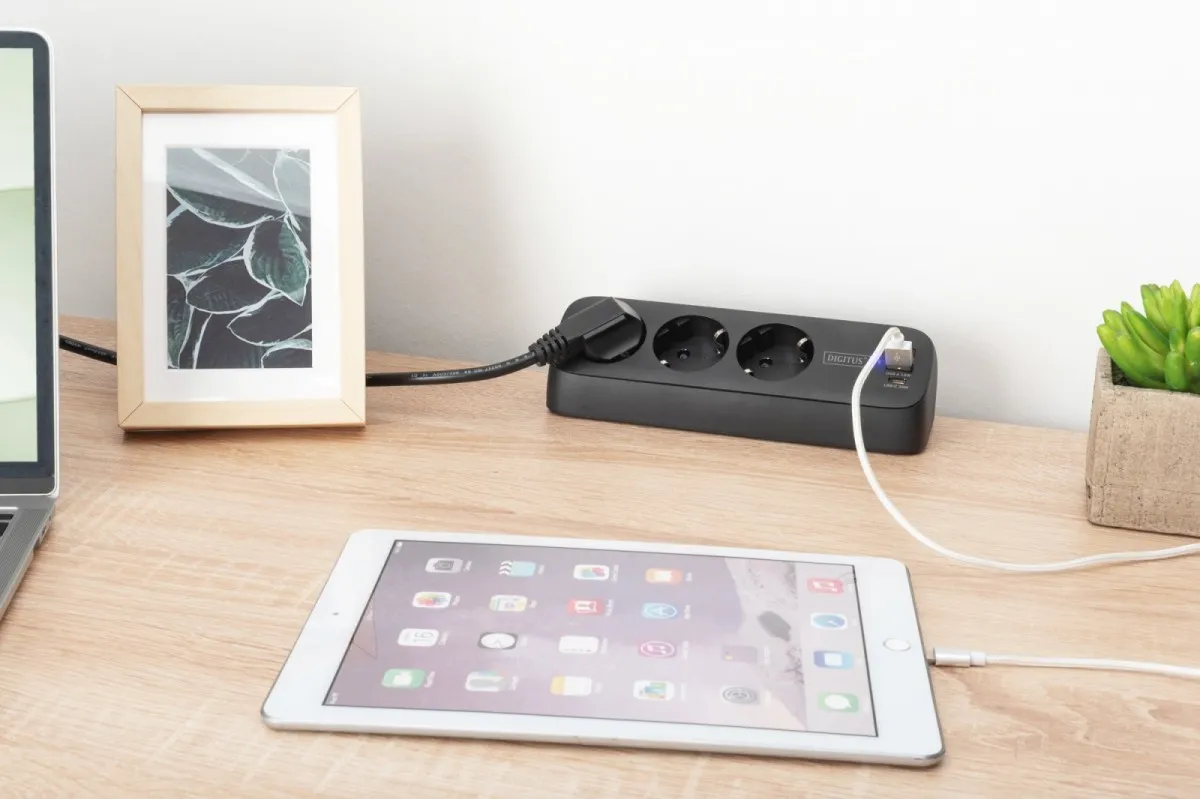 Komputery i podzespołyPodzespołyZasilaczeListwy zasilająceDigitus Listwa zasilająca biurkowa, 3 gniazda Schuko, 2x USB-A (2x 12W), 1x USB-C (30W) z zaciskiem na blat, kabel 1,5m, czarna