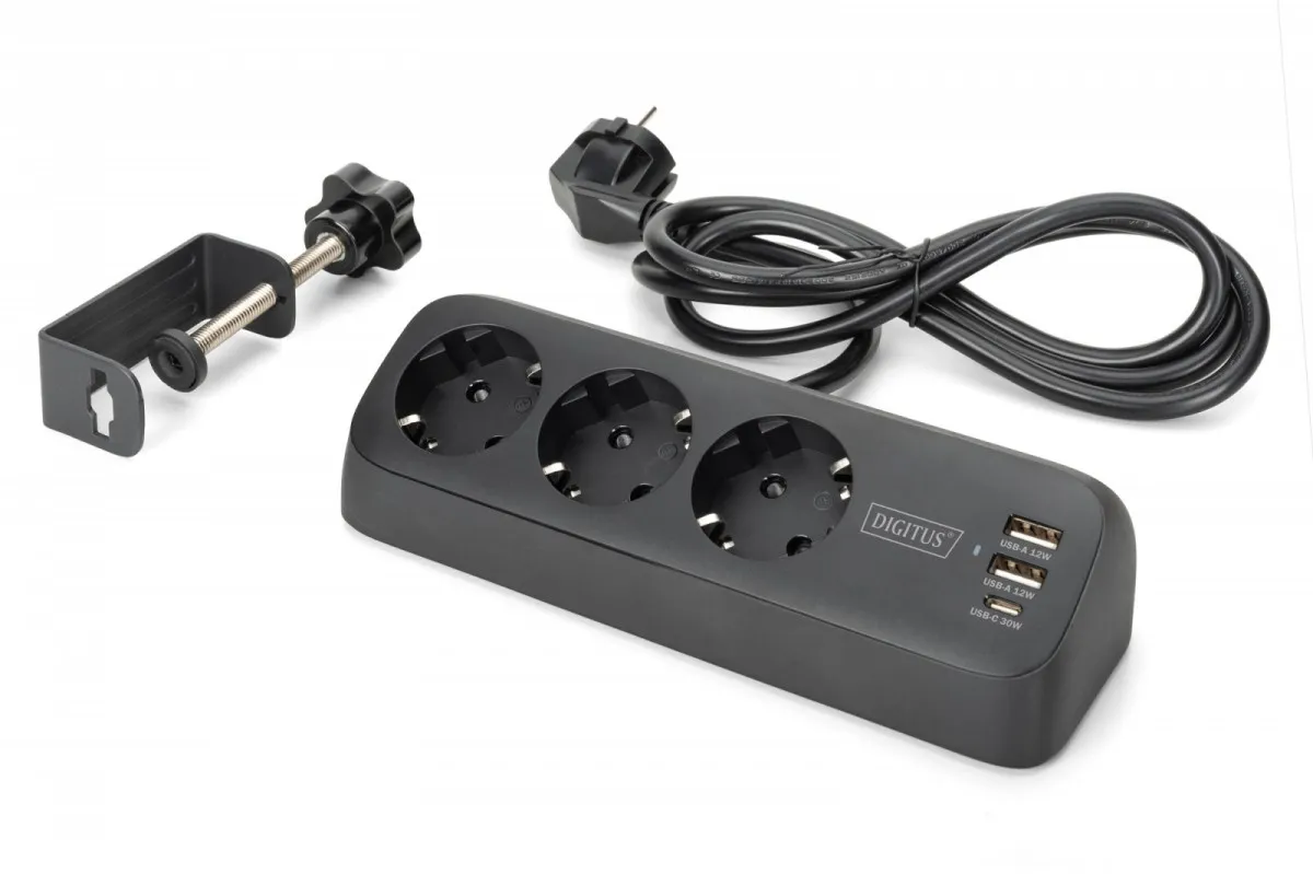 Digitus Listwa zasilająca biurkowa, 3 gniazda Schuko, 2x USB-A (2x 12W), 1x USB-C (30W) z zaciskiem na blat, kabel 1,5m, czarna