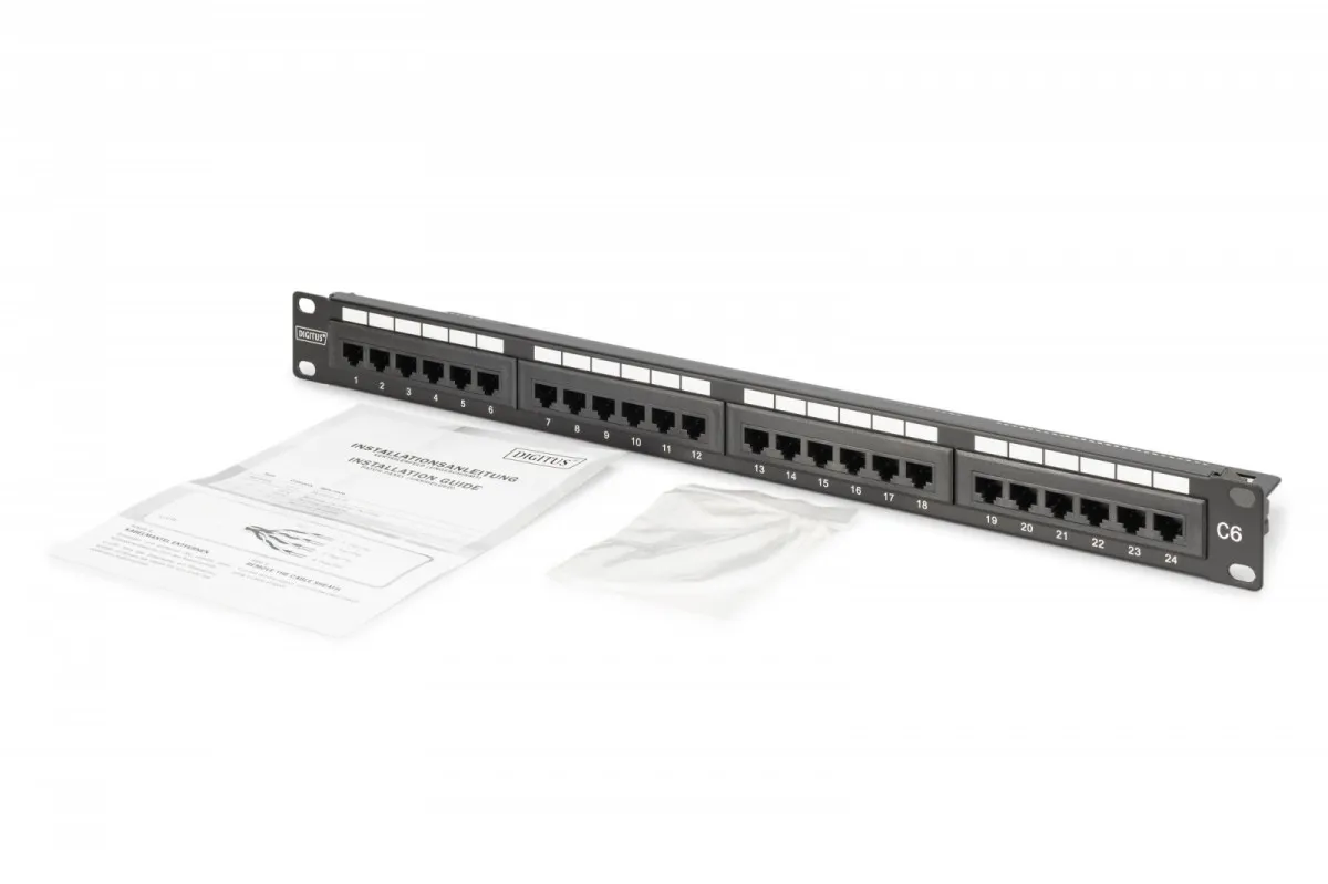 Digitus Panel krosowy (patch panel) 19'' 24x RJ45, LSA pion, kat.6, nieekranowany, 1U, prowadnica kabli, pola opisowe, Czarny
