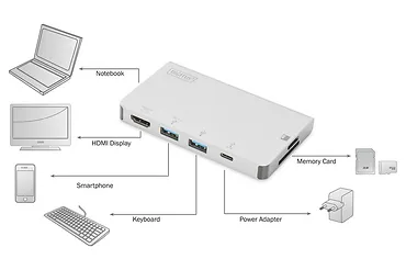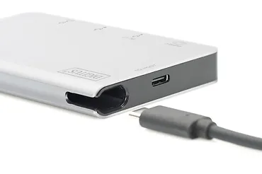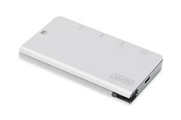 Laptopy i TabletyAkcesoria do laptopówStacje dokujące/replikatory portówDigitus Stacja dokująca podróżna USB Typ C, 6 portów 4K, HDMI, VGA, USB3.0, RJ45, microSD, SD/MMC, srebrna