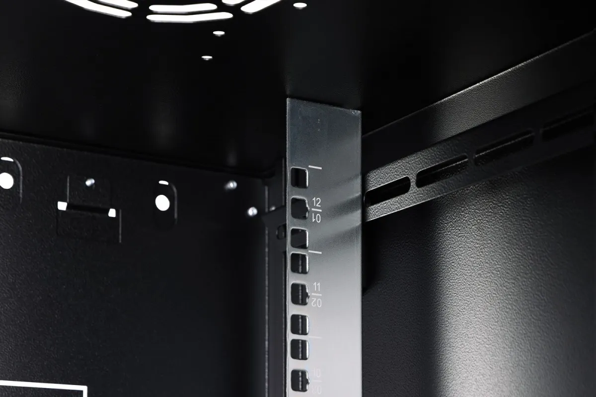 - Szyny profilowe 483 mm (19") z przodu i z tyłu wewnątrz obudowy, ocynkowane
